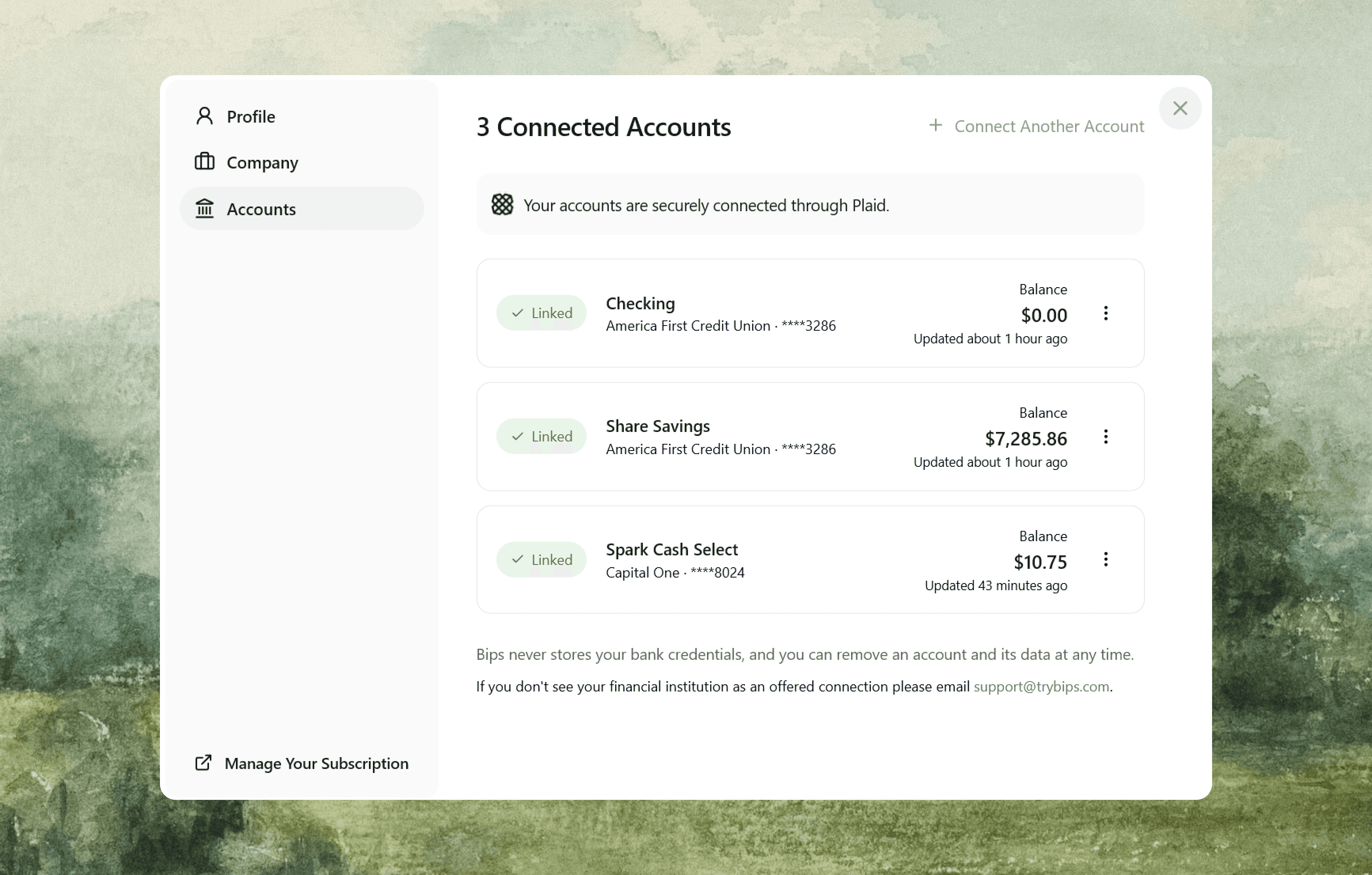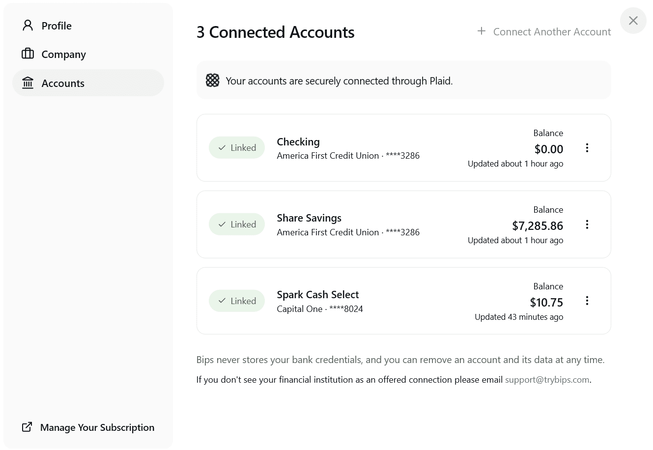 Connect your accounts through Plaid, the same bank-grade security used by Robinhood and Venmo. Bips never sees or stores your login credentials.